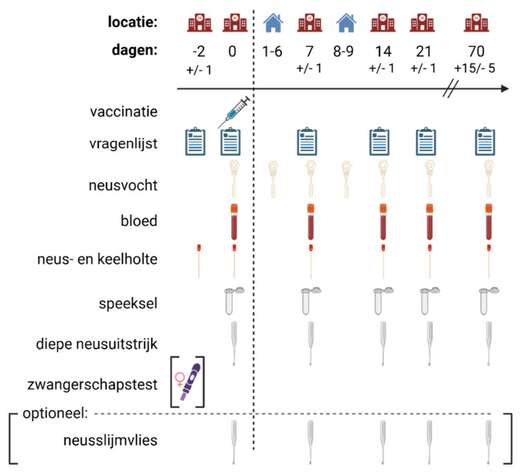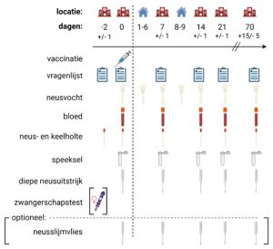 Visite 1 (dag -2): We nemen een vragenlijst af. Ook nemen we een neus/keelswab af om uit te sluiten of u (recent) griep heeft (gehad). Bij vrouwelijke deelnemers nemen we een zwangerschapstest af.