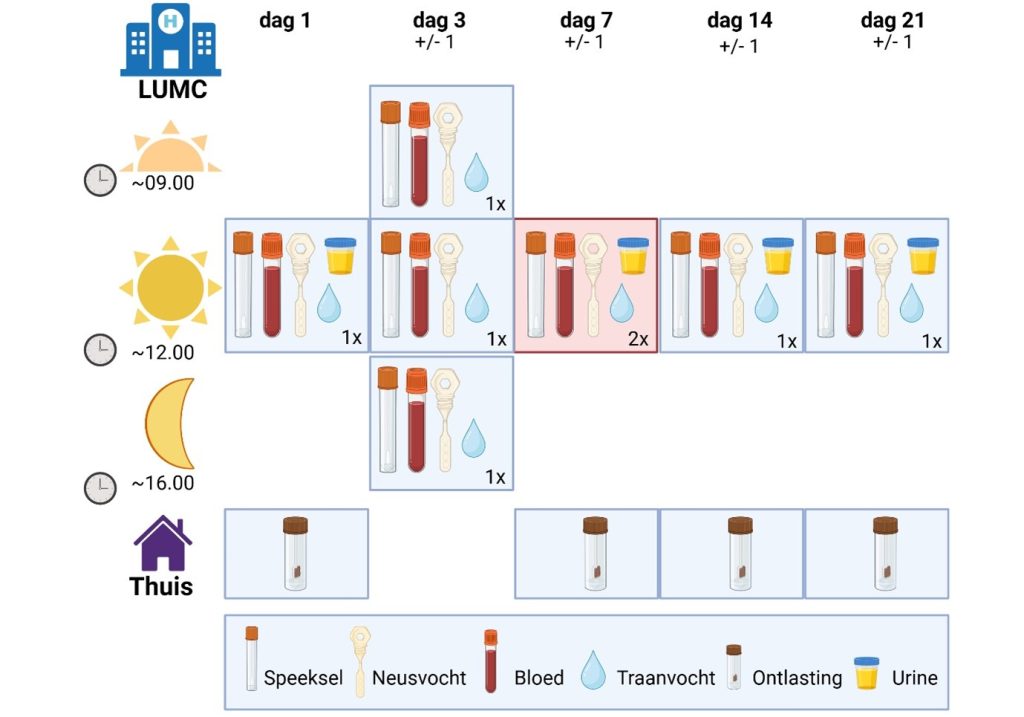 Deelname is vrijwillig en houdt in dat wij u vragen om op 5 dagen naar het LUMC te komen (dag 1, dag 3, dag 7, dag 14 en dag 21). Op dag 3 komt u 3 keer; in de ochtend (rond 9.00), op het midden van de dag (rond 12.00) en in de late middag (rond 16.00). In totaal zijn er 7 momenten waarop wij lichaamsmateriaal van u verzamelen.